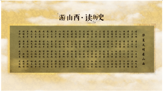 历史品读篇以时间为轴,由儿童诵读场景与景区景点视频组成,穿插尧庙、雁门关、后土祠、运城盐池等山西著名景点风景,讲述了山西五千年的历史文化。