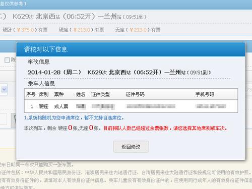 8:02再次刷新显示各车次有车票,记者选择K629次列车进行预定,输入完个人基本信息后提交,显示已无车票。