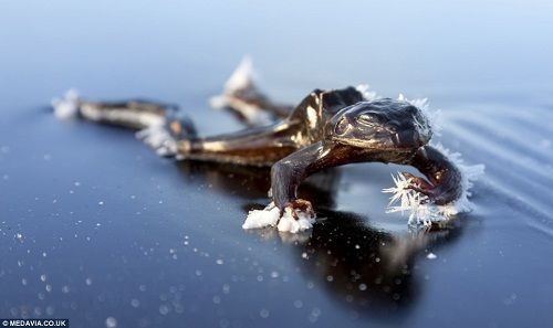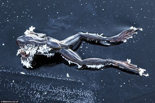 诺德拉姆随即靠近查看,意外发现这是一只被冻得硬邦邦的小青蛙。这只小青蛙虽然已经浑身结冰,却依然保持着前进的姿势,匍匐在冰面上。