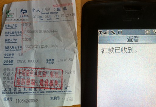 当事人何爱华向枣庄中院法官汇款的凭据