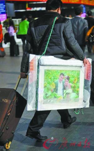 昨日广州火车站,旅客带着婚纱照回家。记者邱伟荣摄