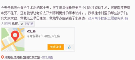 大河网讯(记者 赵檬)“今天是我老公骨折手术后的第十天,医生说尿道断裂要三个月后才能动手术,可是医疗费有点受不住了,还有就想让老公去郑州得到更好的手术治疗,我很挂念村里的那些孩子们,向大家求助,救我老公早日康复,我能早点回到孩子们身边。”大年初六晚上,京港澳高速发生了一起车祸,大学生村官聂磊被撞成重伤,其爱人同为大学生村官的刘华头部也受了轻伤。在入院11天后的2月16日,刘华为了让聂磊得到更好地治疗发出了一条求助微博。