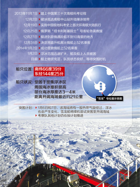 国家海洋局极地考察办公室主任曲探宙说,南极天气瞬息万变,1月6日天气可能有转好趋势,是雪龙船突围的机会。但这个时机非常短暂,需要雪龙船做好准备。雪龙船有160多米长,所谓船大难掉头,要从浮冰区突围,必须提前做好准备,比如调整船头方向,以及防止浮冰在船边堆积。目前船上食品、油料充裕,这方面没有困难和风险。难的是等待时机和捕捉时机,并提前考虑到不利因素,比如快速移动的冰山会给突围行动带来危险。
