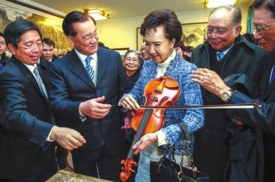 昨天,连战和夫人在北京平谷区挂甲峪村参观。连战夫妇试拉小提琴,小提琴来自平谷东高村镇提琴基地,出口到世界各地。