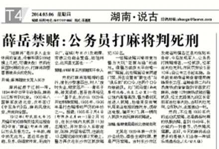 本文摘自《快乐老人报》2014年3月6日第4版 作者:任大猛 原题为:《薛岳禁赌:公务员打麻将判死刑》