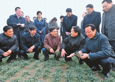 1月18日上午,中共中央政治局委员、国务院副总理汪洋在遂平县常庄镇高标准粮田万亩示范方查看小麦苗情长势。⑤3 本报记者 郭宇摄