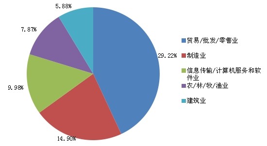 2013年,河南省人才市场招聘单位主要集中在贸易/批发/零售业、制造业、信息传输/计算机服务和软件业、农/林/牧/渔业、建筑业。此五个行业所占招聘单位总数比例的近70%,是吸纳人才的大户。