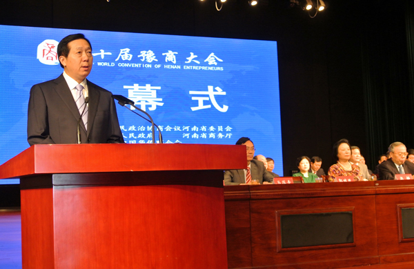 中国日报河南记者站8月28日电(向明超 陈凤岳)第十届豫商大会于2015年8月28日在河南省信阳市举行。河南省政协主席叶冬松,河南省委原书记徐光春,全国政协教科文卫体委员会副主任、河南省政协原主席、河南省豫商联合会名誉会长王全书,河南省副省长王铁,河南省政协副主席邓永俭,河南省政协副主席、省工商联主席梁静,河南省政协原副主席、省豫商联合会会长陈义初,以及来自全国各地及国外的豫商商会的会长、秘书长、优秀豫商代表、河南本地优秀企业家代表、国内外商会研究专家等领导和嘉宾在信阳市百花之声举行了开幕式。