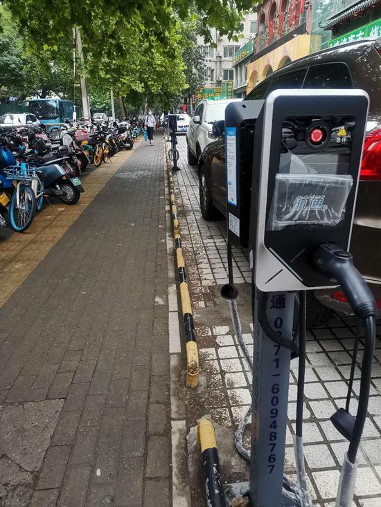 在郑州市紫荆山路某公共停车场,刚建成的充电桩已经开始投入使用,管理人员表示,这段时间附近的充电设备都开始多了起来:“这充电桩才装好,俺这个停车场装了十几个吧可以用,旁边硝滩街上也有,也可以去那边。”