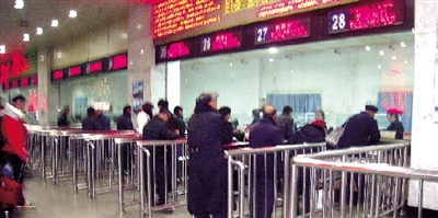 昨日上午9点半,记者来到郑州火车站东广场,看到男女老少的乘客携带着行李包裹来来往往。在购票大厅,每个窗口前面排队买票的人并不多,三三两两的,有的五六个人,有的一两个人,有的窗口甚至还空着。经过询问了解到,这些乘客中有不少是在网上或拨打订票热线电话预定车票后前来取票的乘客,也有一些放假回家的大学生。
