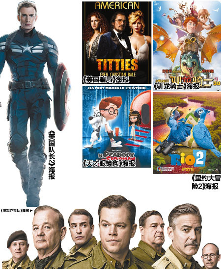 本周五,以《盟军夺宝队》为首的3部好莱坞进口片将在全国公映,算上确定将在下月公映的《美国队长2》和《里约大冒险2》、以及确定近期上映不确定具体日期的《美国骗局》,一年一度的好莱坞大片内战模式终于提前开启。